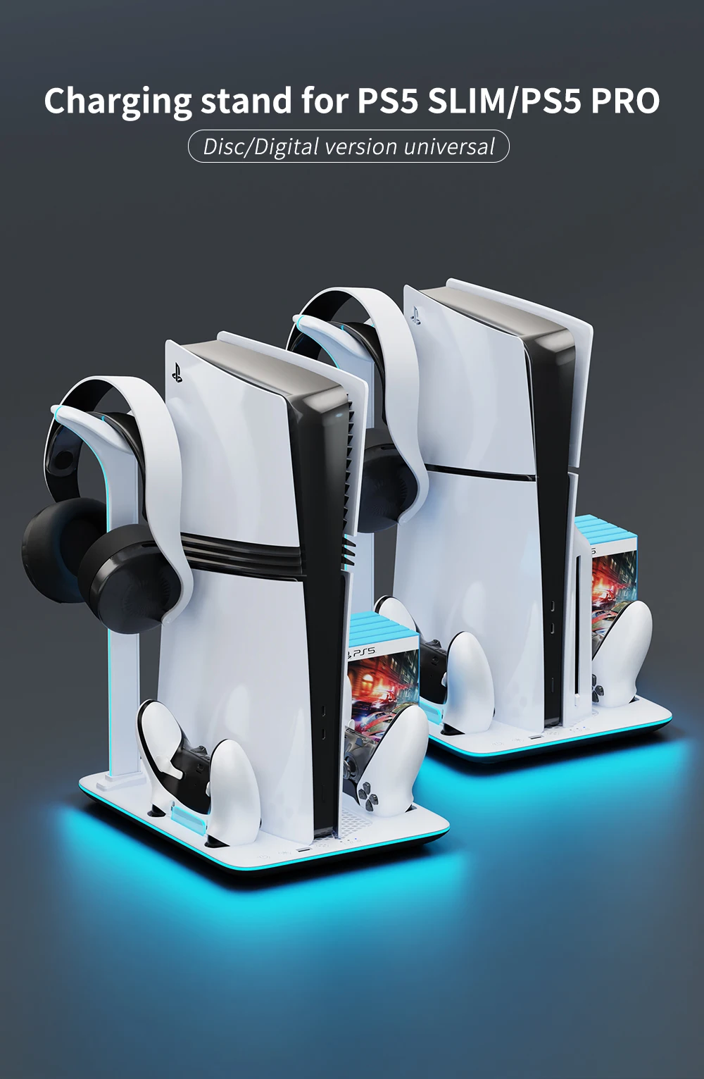Suporte de resfriamento para console PS5 Slim e Pro, estação de carregamento de controlador duplo com 7 luzes RGB para disco de console PS 5 Slim e digital