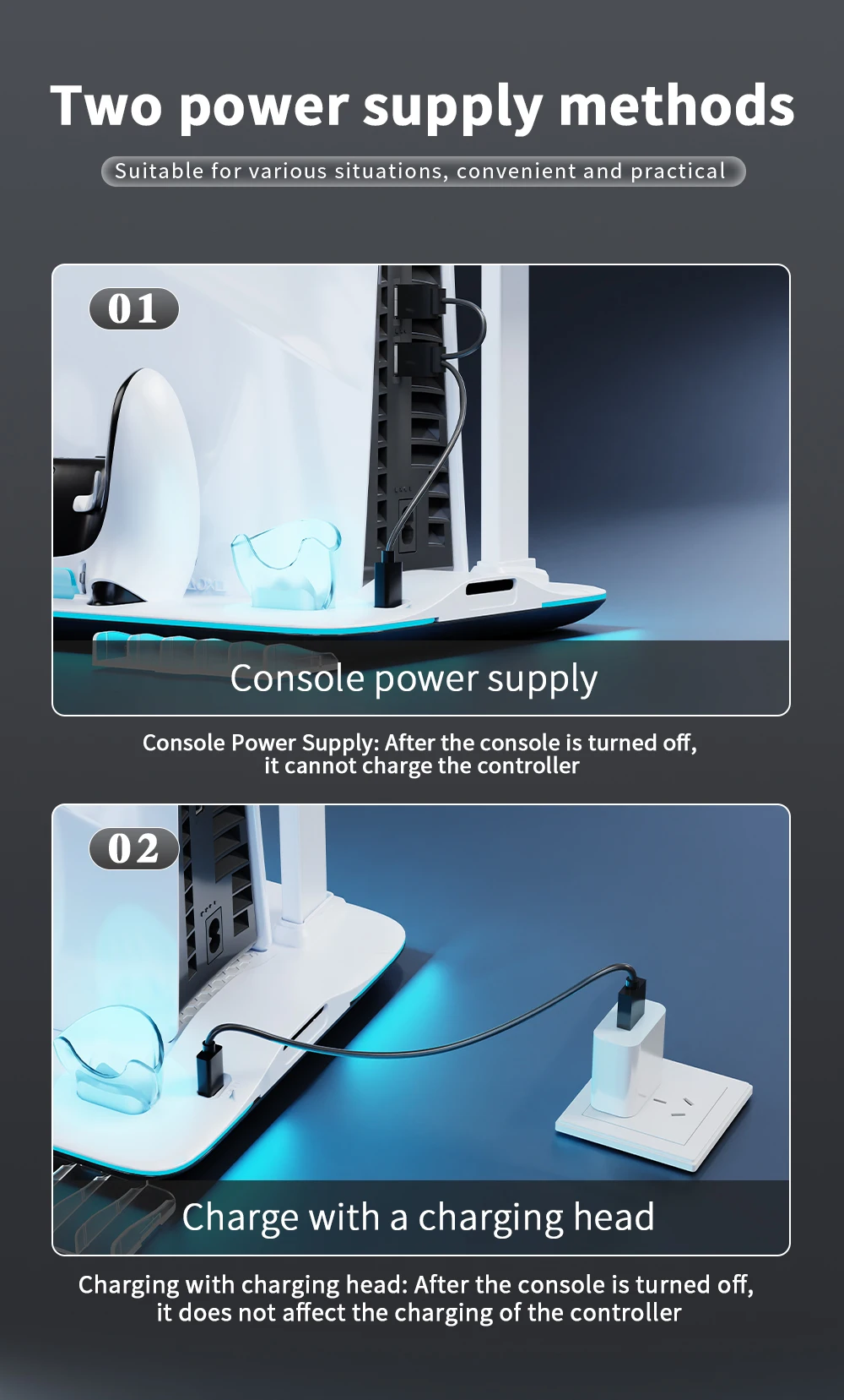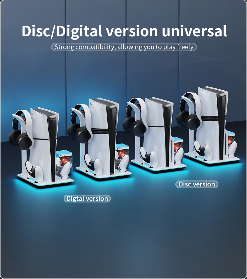 3.?Excelente design de espaço?A base de carregamento ultrafina HONCAM ajuda você a criar um ambiente de jogo mais organizado e visual.Esta estação vertical multifuncional pode conter 1 console PS5 e 2 controladores de carregamento ao mesmo tempo.Ele fornece 5 caixas de armazenamento de cartões de jogo, que podem ser colocadas na parte inferior da base para armazenamento quando você não estiver usando.Equipado com um suporte para fone de ouvido RGB independente, permitindo armazenar fones de ouvido de forma mais conveniente.Este pacote de acessórios PS5 economiza espaço na área de trabalho e também oferece uma melhor experiência de jogo