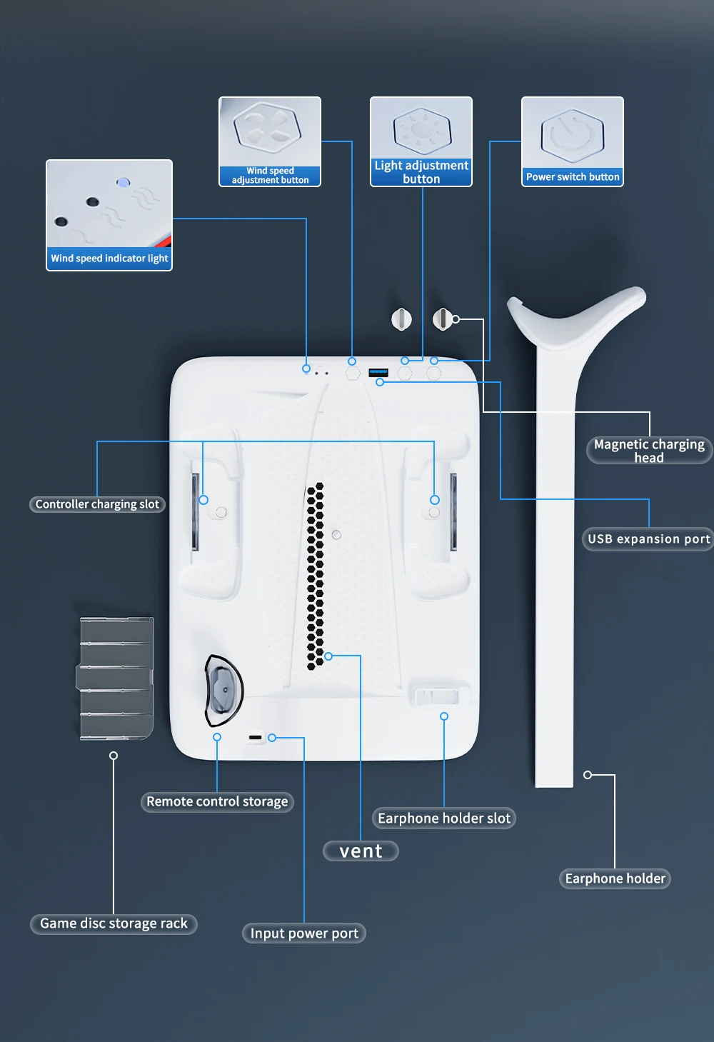 4.?3 modos de ventilador e 7 luzes RGB? Adotando tecnologia de resfriamento avançada para manter seu console PS5 Slim funcionando na temperatura ideal durante longas sessões de jogo, o suporte para PS5 possui 3 modos de resfriamento ajustáveis.O design do turbo fan atualizado integrado melhora o fluxo de ar ao redor do console para evitar o superaquecimento e prolongar o tempo de uso do console.Há um interruptor de toque para controlar a iluminação RGB, pressione rapidamente o botão de toque RGB para alternar facilmente entre 7 cores RGB, pressione o botão de toque RGB por 3s para ligar/desligar a luz.O suporte fino playstation 5 lembra o modo de iluminação anterior e a posição do ventilador após a reinicialização